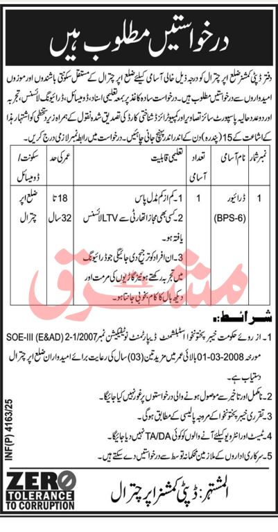 Only Male candidates can apply for this Deputy Commissioner Office Chitral Driver Jobs October 2025 Qualification /Experience Required: At Least Middle Pass / LTV Driving License / Driving Experience / Vehicles Repairing Experience / Age Limit: 18 To 32 Years old, and more experienced candidates should apply before 15 October 2025.
