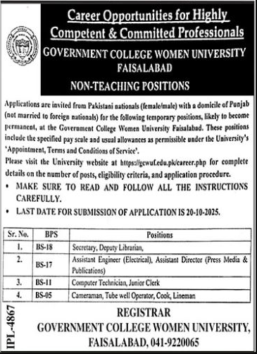 The last date to apply for this job is 20th October 2025.Government College Women University Faisalabad Jobs October 2025 Advertisement
