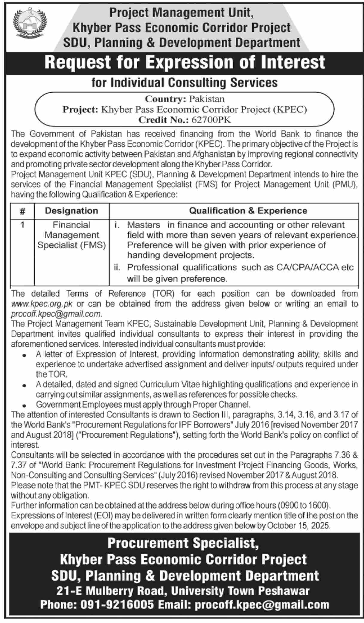 Candidates if you are seeking the Khyber Pass Economic Corridor Project SDU Jobs October 2025 if yes. It would be best if you tried to complete read this Khyber Pass Economic Corridor Project job because you can easily apply for these vacancies Financial Management Specialist (FMS). Only male candidates can apply for this Khyber Pass Economic Corridor Project SDU Jobs October 2025 Qualification /Experience Required: Professional qualifications such as CA/CPA/ACCA etc will be given preference. Masters in finance and accounting or other relevant field with more than seven years of relevant experience. Preference will be given with prior experience of handing development projects, and more experienced candidates should apply before 15 October 2025.