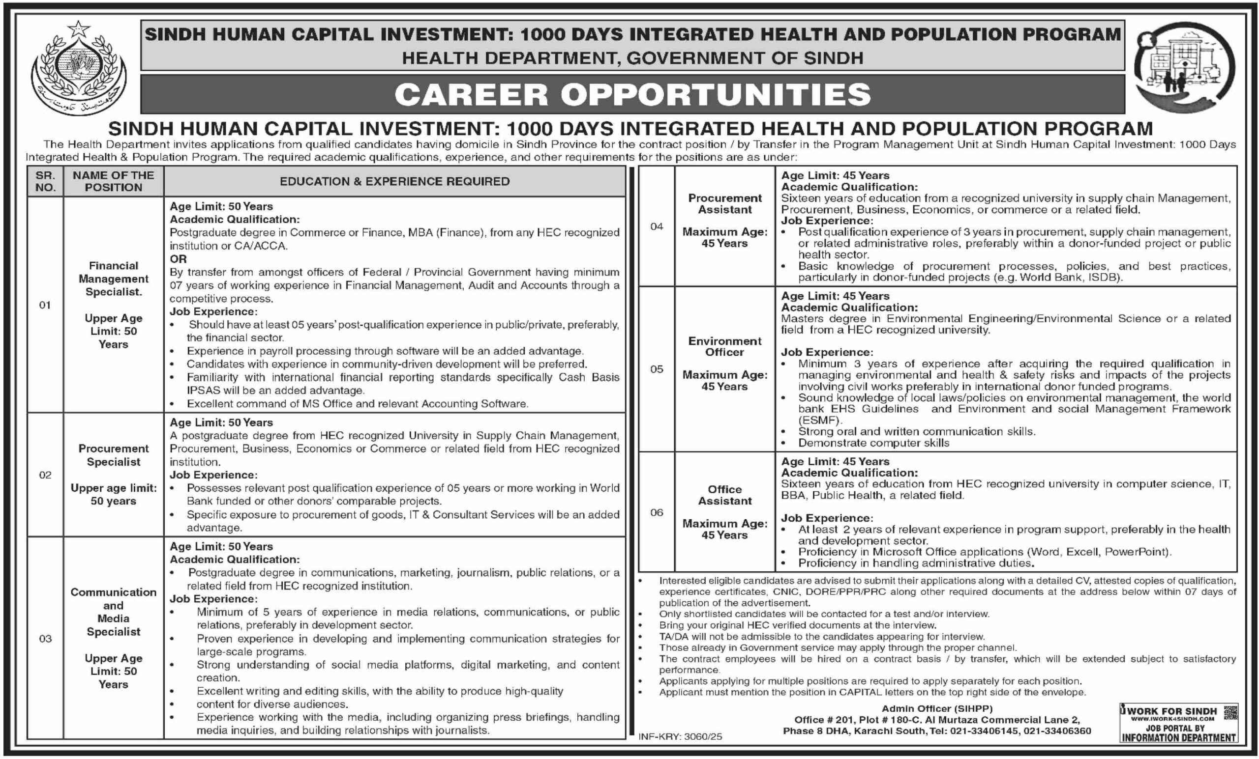 Candidates if you are seeking the Sindh Human Capital Investment Health And Population Program Jobs October 2025 if yes. It would be best if you tried to complete read this Sindh Human Capital Investment Health job because you can easily apply for these vacancies Financial Management Specialist. Procurement Specialist Communication and Media Specialist Procurement Assistant Environment Officer Office Assistant.