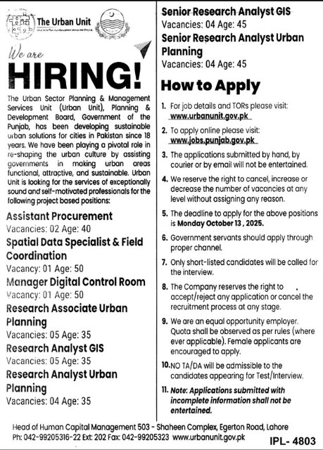 Candidates if you are seeking the The Urban Unit Plaining And Management Service Unit Jobs October 2025 if yes. It would be best if you tried to complete read this The Urban Unit Plaining And Management job because you can easily apply for these vacancies Assistant Procurement Vacancies: 02 Age: 40 Spatial Data Specialist & Field Coordination Vacancy: 01 Age: 50 Manager Digital Control Room Vacancy: 01 Age: 50 Research Associate Urban