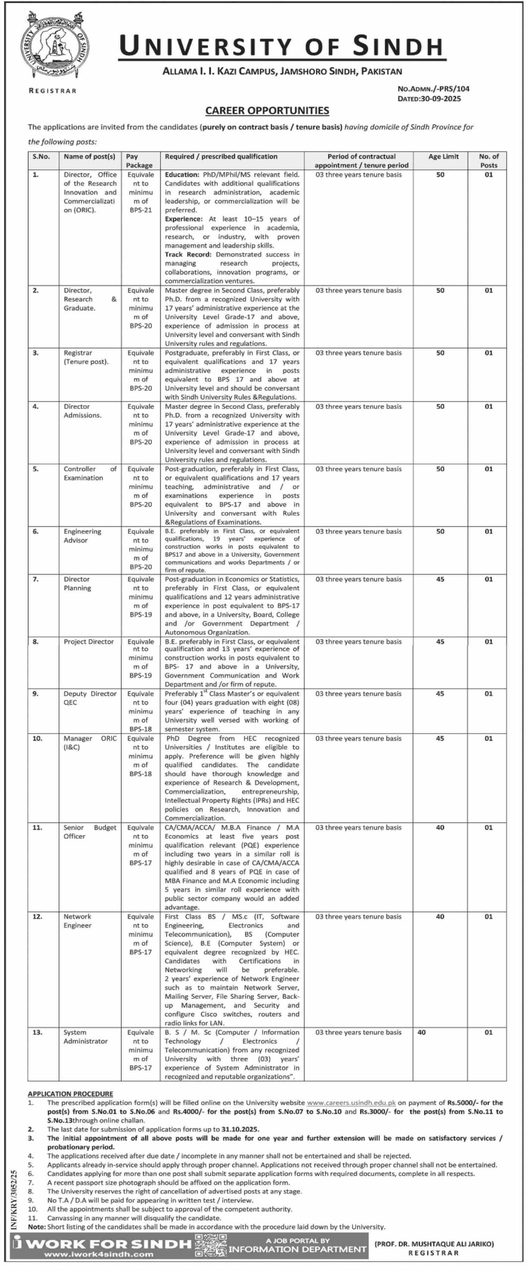 Candidates if you are seeking the University of Sindh Allama I.I Kazi Campus Jobs In Jamshoro October 2025 if yes. It would be best if you tried to complete read this University of Sindh Allama I.I Kazi Campus job because you can easily apply for these vacancies Director, Office of the Research Innovation and Commercializati on (ORIC). Director, Research Graduate. Registrar (Tenure post). Director Admissions. Controller Examination Engineering Advisor Director Planning Project Director. Only male candidates can apply for this University of Sindh Allama I.I Kazi Campus Jobs In Jamshoro October 2025 Qualification /Experience Required: Master degree in Second Class, preferably Ph.D. from a recognized University with 17 years’ administrative experience at the University Level Grade-17 and above, experience of admission in process at University level and conversant with Sindh University rules and regulations. Postgraduate, preferably in First Class, or equivalent qualifications and 17 years administrative experience in posts equivalent to BPS 17 and above at University level and should be conversant with Sindh University Rules & Regulations. Master degree in Second Class, preferably Ph.D. from a recognized University with 17 years’ administrative experience at the University Level Grade-17 and above, experience of admission in process at University level and conversant with Sindh University rules and regulations. Post-graduation, preferably in First Class, or equivalent qualifications and 17 years teaching, administrative and/or examinations experience in posts equivalent to BPS-17 and above in University and conversant with Rules & Regulations of Examinations., and more experienced candidates should apply before 31 October 2025.